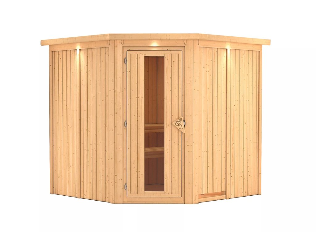 Finská sauna pro dvě osoby. Má čtvercový tvar š 196 x h 196 x v 198 cm s rohovým vstupem. Tento model finské sauny je určený do temperovaných interiérů domu nebo bytu. Její výrobce, firma KARIBU HOLZTECHNIK z německých Brém, dokázala svými výrobky úspěšně navázat na staletou tradici skandinávského saunování a současně do ní zapracovat dnešní moderní technologie. Sauna je celá vyrobena ze dřeva severského smrku v přírodním provedení. Dřevo pochází ze vzdáleného severu Evropy a je chemicky naprosto neošetřené (není ani namořeno ani nalakováno). V důsledku toho je prosté všech známých problematických látek, které by se v průběhu saunování mohly ze dřeva uvolňovat. Tato interiérová sauna vykazuje mimořádné tepelně-izolační vlastnosti. Stěny sauny jsou složeny z vnitřní a vnější vrstvy speciálně hlazených prken s perem a drážkou, mezi kterými je 42 mm silná tepelná izolace v podobě minerální vlny. Celková síla stěny je tak 68 mm. Zadní nebo boční nepohledové strany orientované ke stěně místnosti mají vnější stranu ze sololitu. Proto jsou při stejné tepelné izolaci o cca 10 mm tenčí než pohledové strany pokryté palubkami.