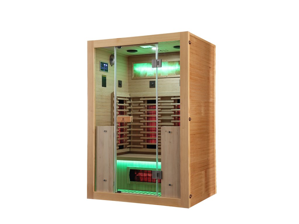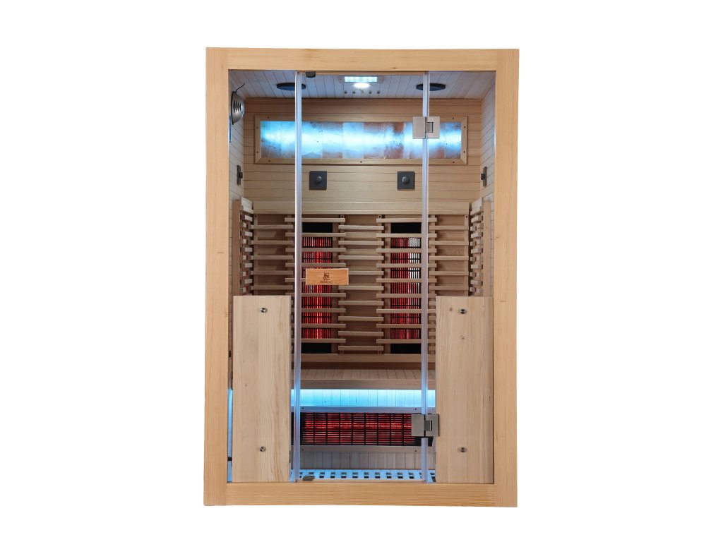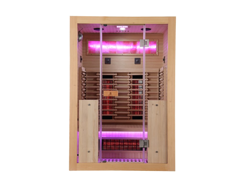 Infrasauna pro 2 osoby, 130x110x204 cm, 7x RedGlass s RLT filtrem pro terapii pomocí červeného světla ( 2x záda, 2x přední, 2x boční 1x lýtkový ), 1x podlahový karbonový zářič, zónová regulace výkonu, Hemlock, světelná terapie v provedení Skylight, MP3, ventilátor, ionizátor, solná terapie
