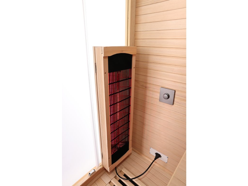 Infrasauna pro 2 osoby, 120x105x190 cm, 5x fullspektrální zářič Vitae ( 2x záda, 2x přední boční, 1x lýtkový ), 2x boční karbonový zářič, 1x podlahový karbonový zářič, zónová regulace výkonu zářičů, Hemlock, MP3, Bluetooth, Světelná terapie, ionizátor