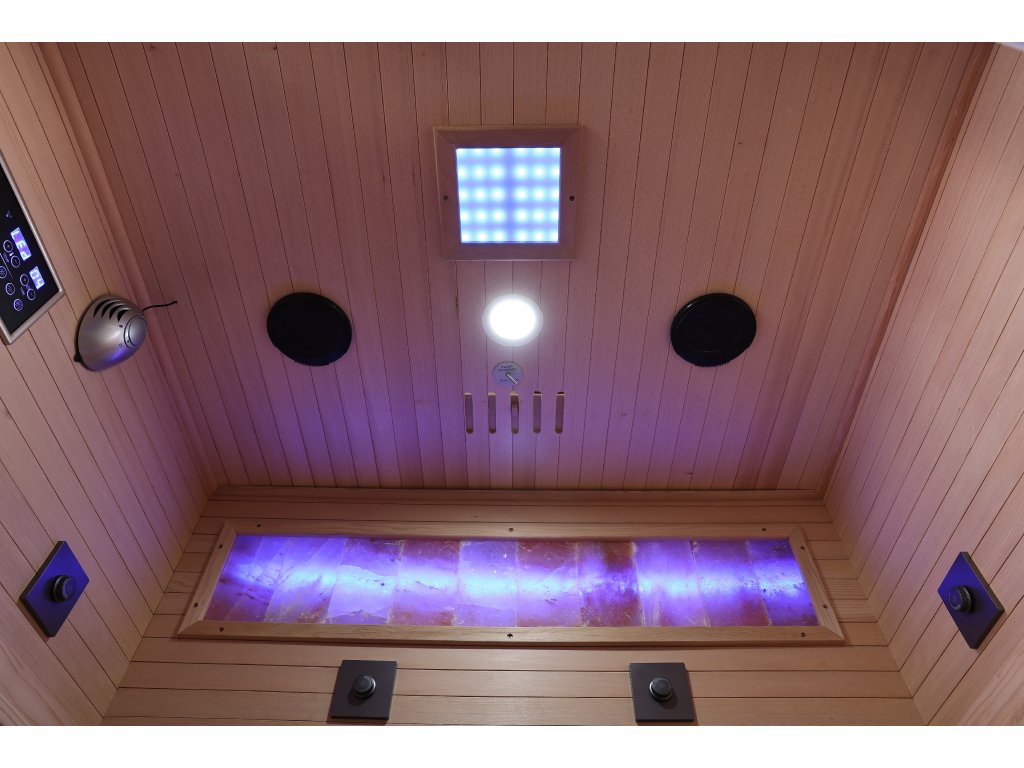 Solná terapie - panely himalájské soli zabudované ve stěně infrasauny působí příznivě na dýchací cesty a zlepšují kvalitu pokožky. Navíc po zapnutí jejího podsvícení Vás nadchne a evokuje onyxové stěny v luxusních domech