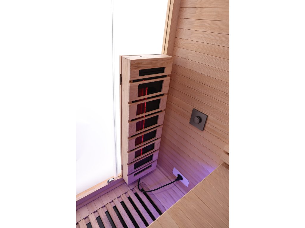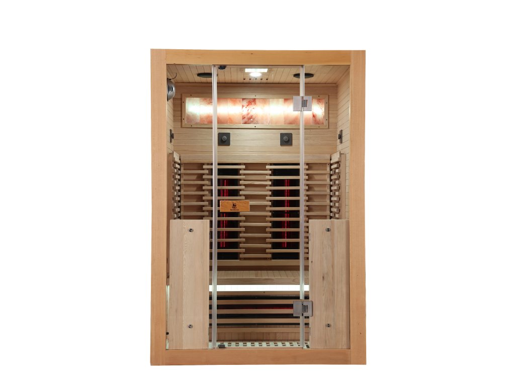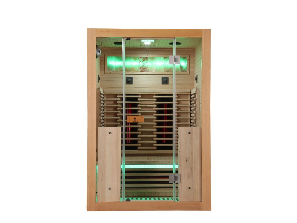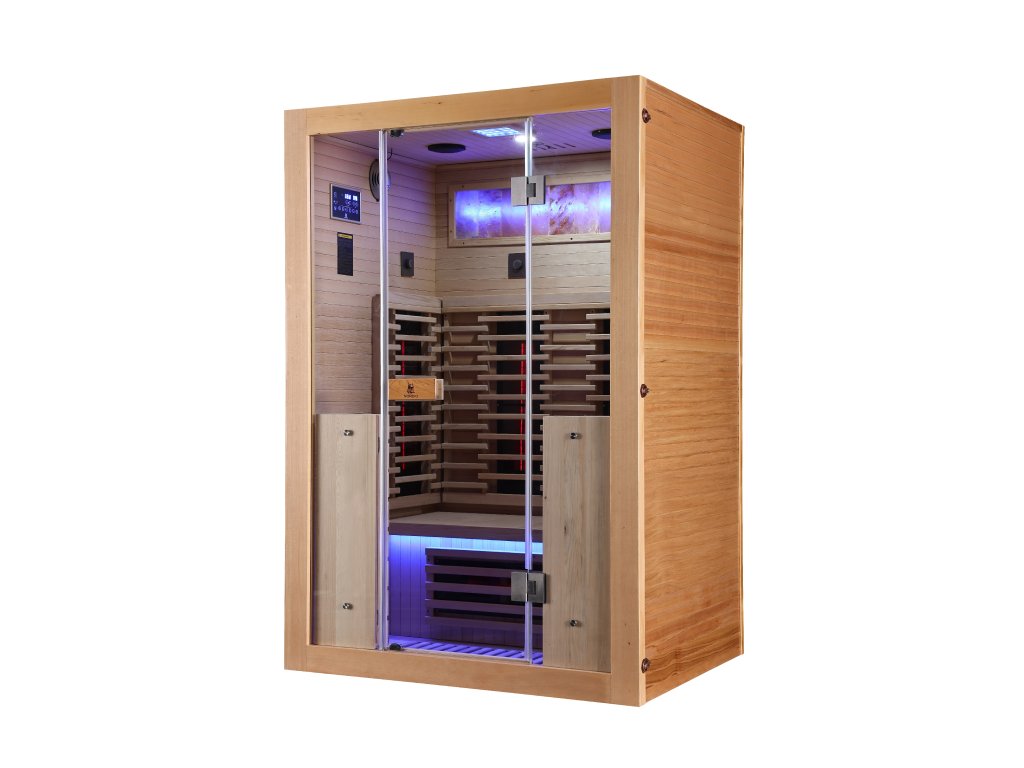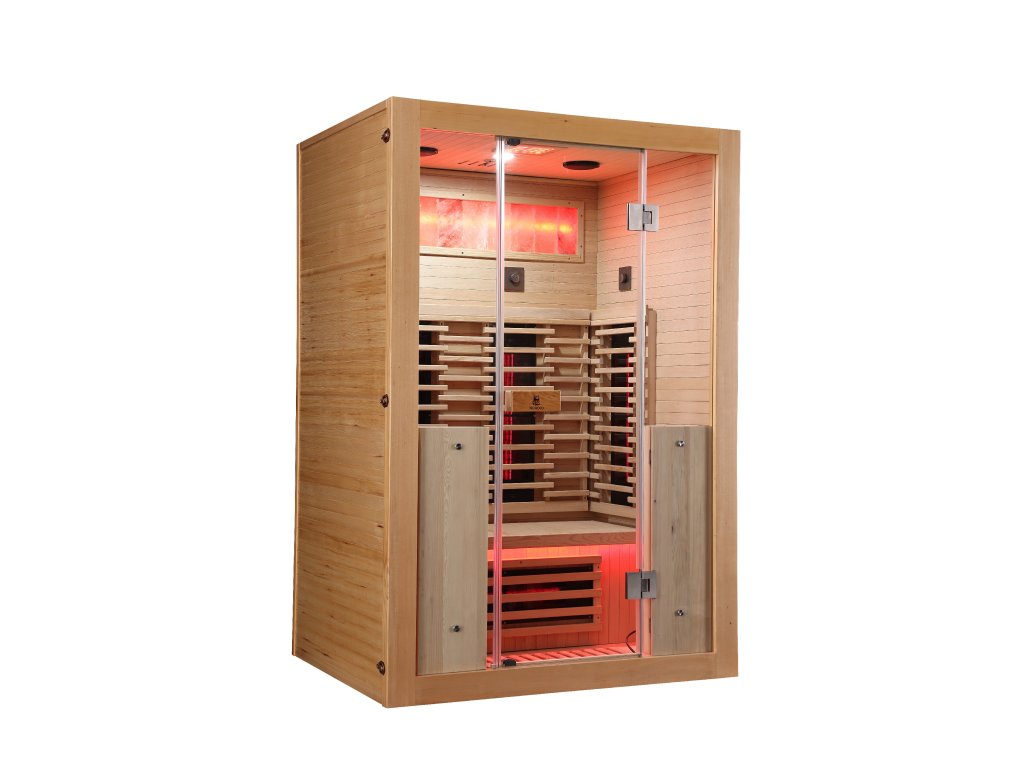 Infrasauna pro 2 osoby, 130x100x190 cm, 7x fullspektrální zářič RedGlass s možností výměny za zářiče Vitae 350W ( 2x záda, 2x boční, 2x přední, 1x lýtkový )+ 1x podlahový karbonový zářič, regulace výkonu zářičů, Hemlock, MP3, Bluetooth, Světelná terapie,Solná terapie ionizátor