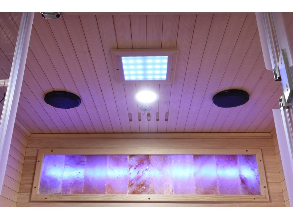Solná terapie - panely himalájské soli zabudované ve stěně infrasauny působí příznivě na dýchací cesty a zlepšují kvalitu pokožky. Navíc po zapnutí jejího podsvícení Vás nadchne a evokuje onyxové stěny v luxusních domech