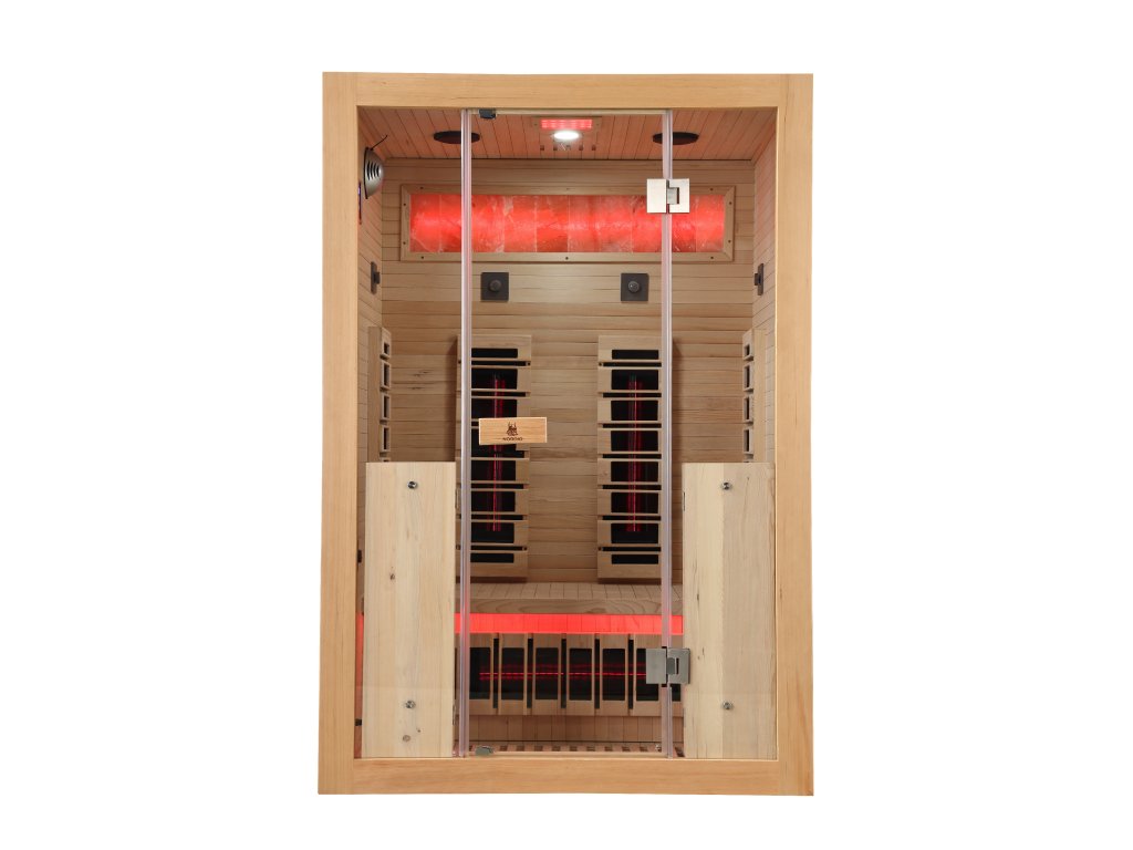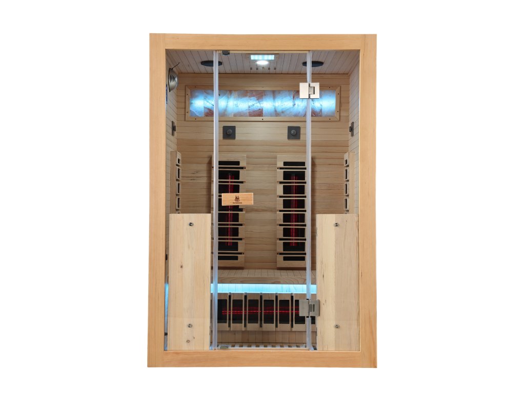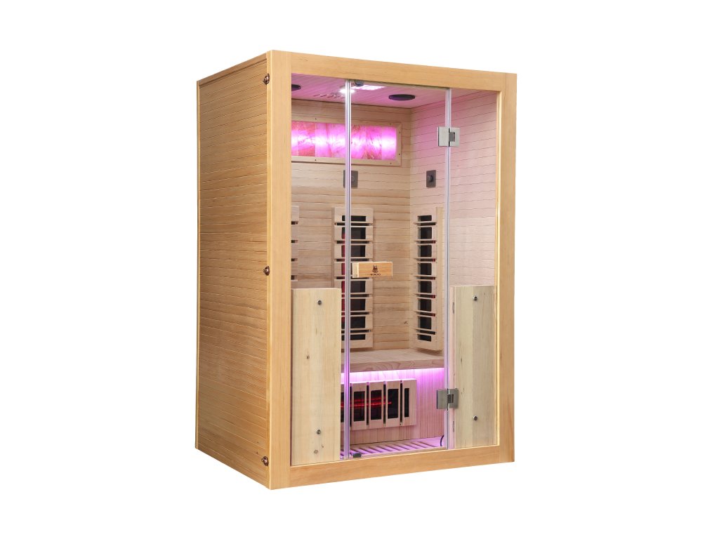 Infrasauna pro 2 osoby, 130x110x204 cm, 7x RedGlass s RLT filtrem pro terapii pomocí červeného světla ( 2x záda, 2x přední, 2x boční 1x lýtkový ), 1x podlahový karbonový zářič, zónová regulace výkonu, Hemlock, světelná terapie v provedení Skylight, MP3, ventilátor, ionizátor, solná terapie