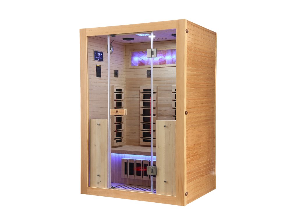 Infrasauna pro 2 osoby, 130x100x190 cm, 7x fullspektrální zářič RedGlass s možností výměny za zářiče Vitae 350W ( 2x záda, 2x boční, 2x přední, 1x lýtkový )+ 1x podlahový karbonový zářič, regulace výkonu zářičů, Hemlock, MP3, Bluetooth, Světelná terapie,Solná terapie ionizátor