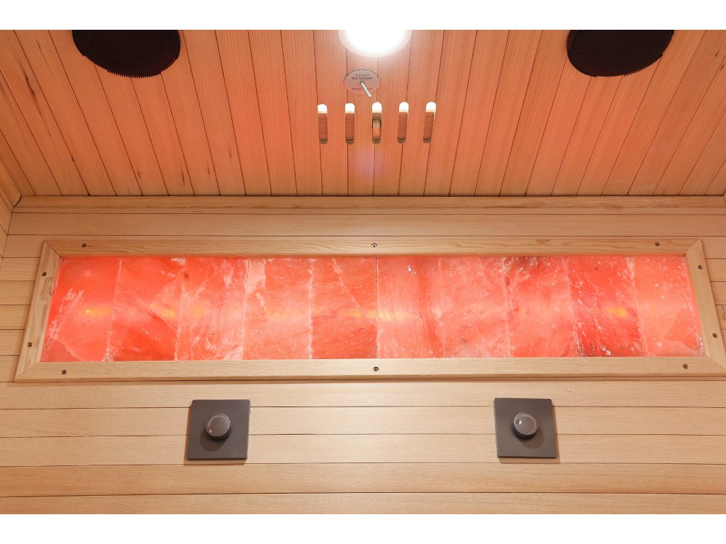 Solná terapie - panely himalájské soli zabudované ve stěně infrasauny působí příznivě na dýchací cesty a zlepšují kvalitu pokožky. Navíc po zapnutí jejího podsvícení Vás nadchne a evokuje onyxové stěny v luxusních domech