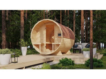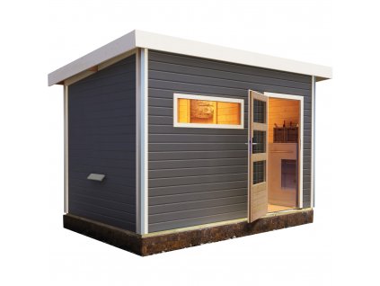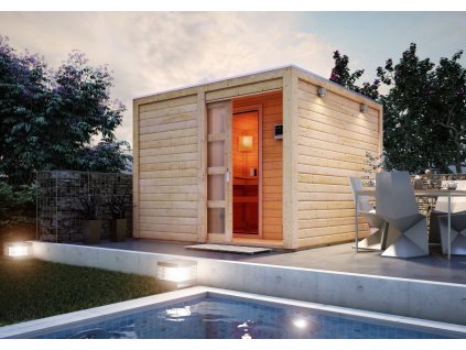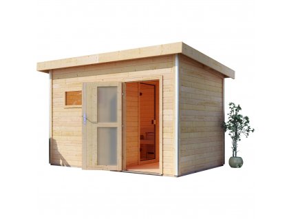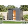 Venkovní finská sauna, stěna 38 mm, vnější rozměry š 231 x h 196 x v 238 cm, určeno pro 3 osoby.